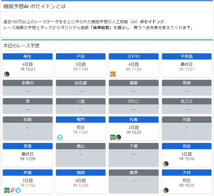 競艇予想AIポセイドンというサイトで、実際にポセイドンが組み立てた予想を見ることができます。