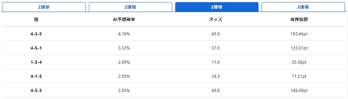 オッズとAI予想数値を掛け合わせた数値となっており、この数値が高ければ高いほど、稼ぎやすい買い目であることが読み取れます。