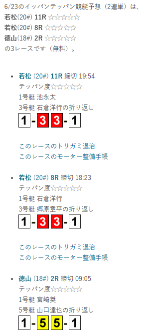2022年6月23日に公開されたイッパンテッパン予想(2連単)は3つあり、3つともテッパン度は最大の☆5だ。