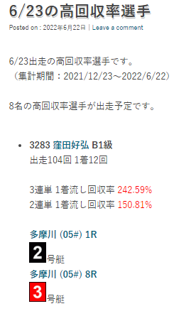 画像のように「出走回数・1着回数・3連単1着流し回収率・2連単1着流し回収率」が記載されていて、集計期間に集めたデータから回収率を出して高回収率選手を出走するレースと舟番と共に紹介している。