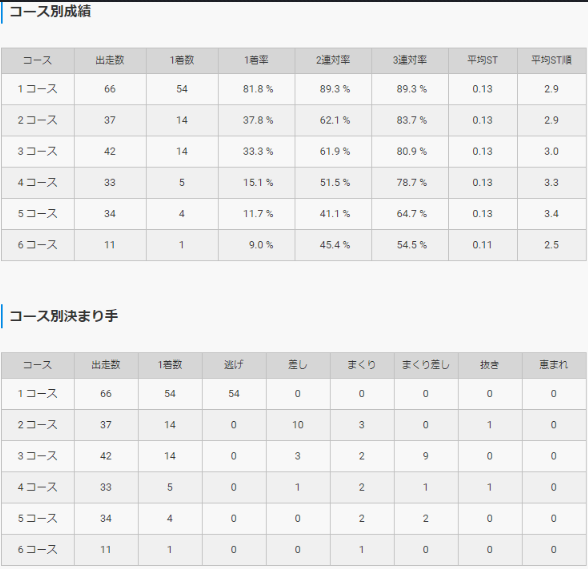 コース別成績では、各コースの1着率・連対率・平均STなどがわかる。