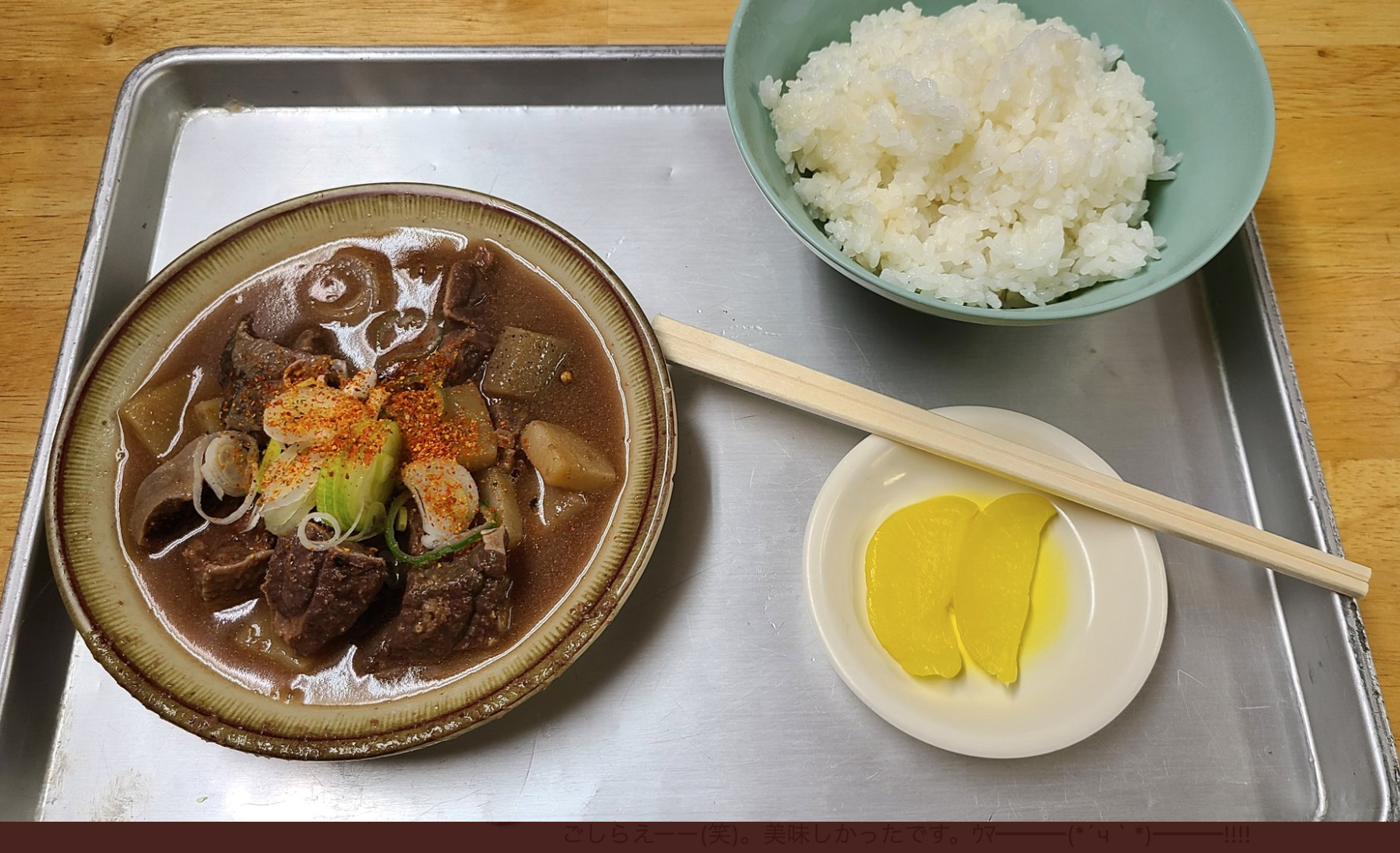 付け合わせにキムチと唐辛子、ニンニク添えられているのよ。ホロホロの牛肉は4時間も煮込んでいるから。