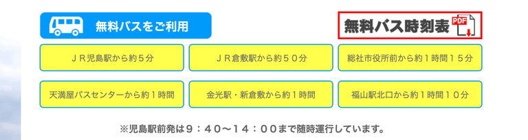 アクセスは以上の方法が便利♪無料バスの時刻表は、ボートレース児島(児島競艇場)の公式サイトで確認できるからチェックしてね!