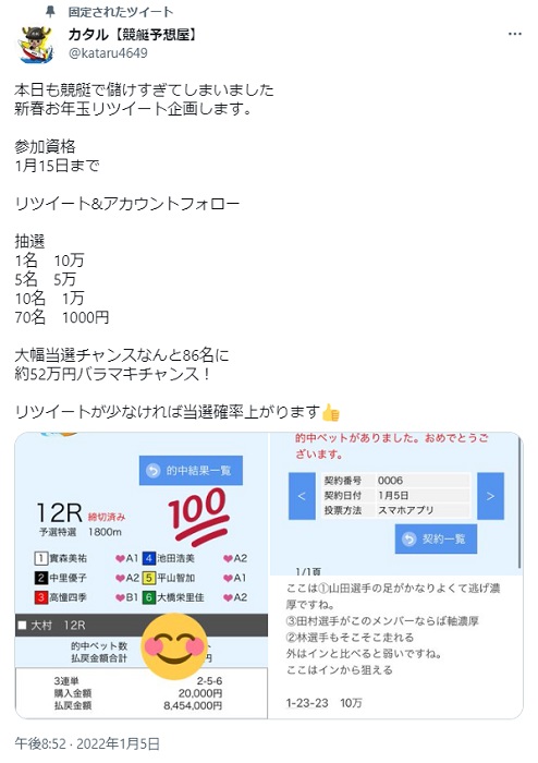 フォロワー数が多いのには過去にプレゼント企画を行っていたことも関係してると思いますし、本気で稼ぐためにカタルさんの予想を買うのは良くないかもしれません!