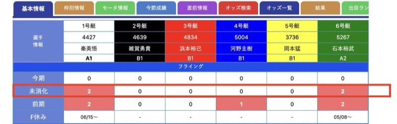 選手情報にフライング未消化を意味する「未」が記載されていた場合、隠れフライング持ちです。