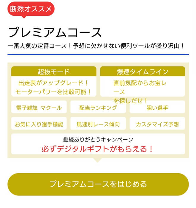 こちらのコースはプレミアムと名前がつくだけあり、選手や競艇場の情報から予想まで、通常では手に入りにくい情報が多数もらえるようです。