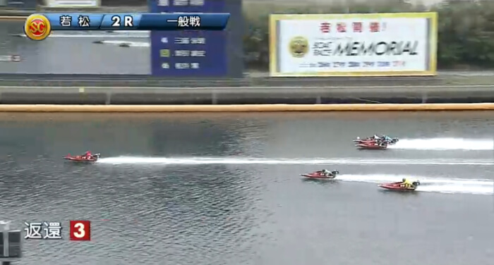 流れはそのまま2マークに移るのですが、なんとここで2号艇・西山が5号艇・宮地と接触。