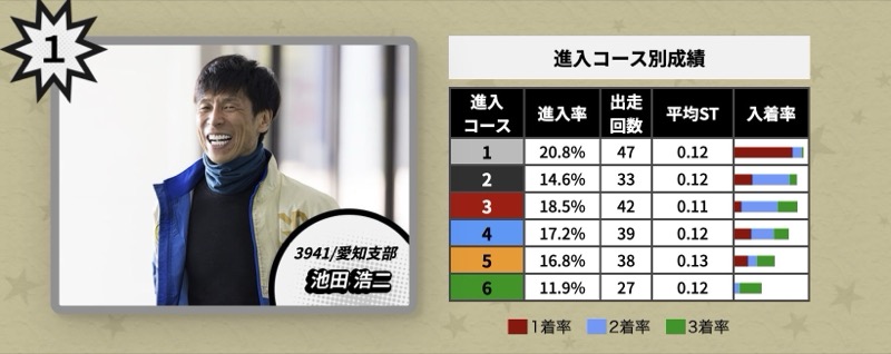 しかも、進入コース別成績を確認すると、インコースだけでなく、4コースの1着率も高い。