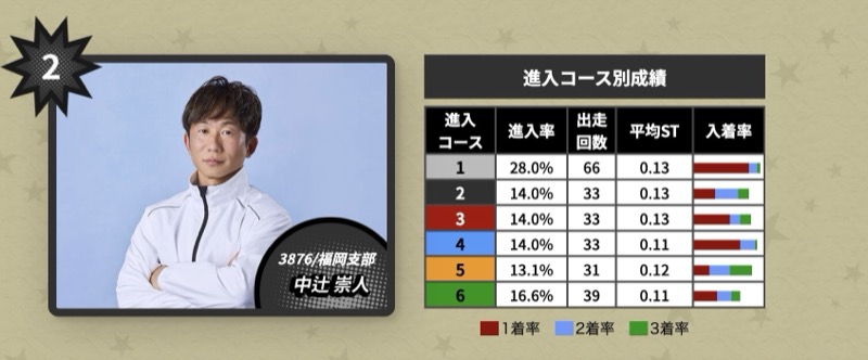 特にボートレース桐生は、4コース・5コースの勝率が高い会場だから、4コースの1着率が高い中辻崇人に注目するとよいかも〜!