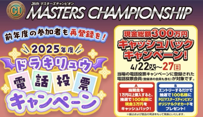 マスターズチャンピオン2025の開催期間中、現金総額300万円のキャッシュバックキャンペーンが開催されるわよ。