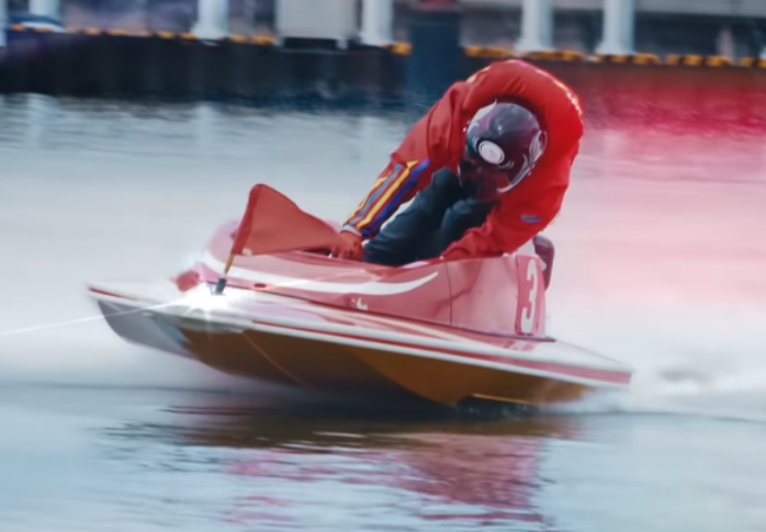 - ボートの上に前傾姿勢で立ち上がり、舟の外側を蹴り回る高速旋回方法