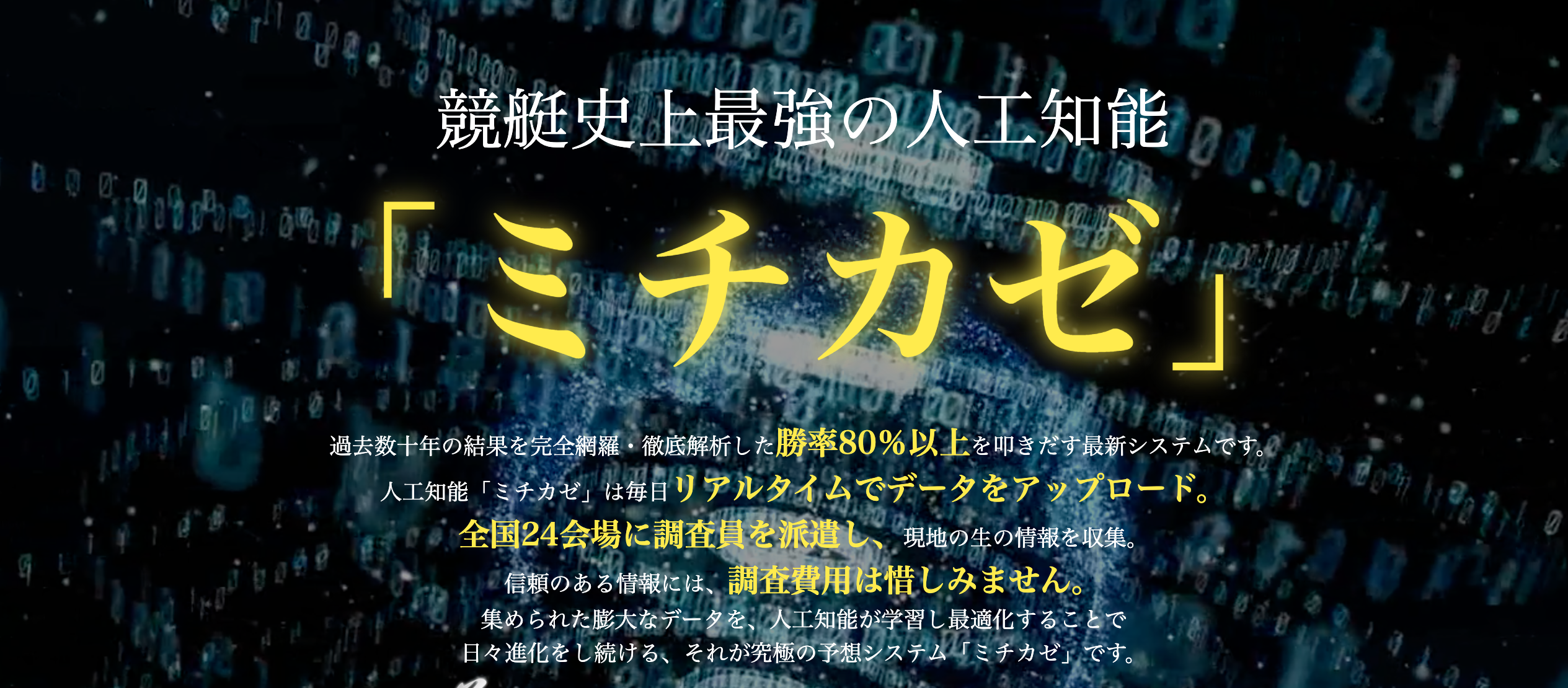 ミチカゼとは過去数十年のデータを解析して勝率80%を叩き出すAI予想です。
