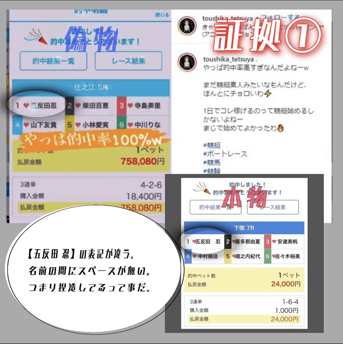 的中結果画面の五反田忍選手の表記が、投資家テツヤさんが上げている画像と実際の表記に違いがあるという点から「偽装なのでは?」という意見が上がっていました。