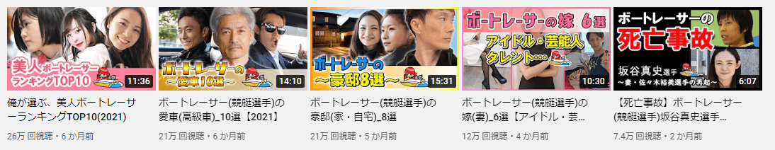 動画は、ボートレーサーに関するものが多く、ボートレーサーの愛車や豪邸、嫁(妻)、または美人ボートレーサーなどの動画が視聴回数が多く人気だ。