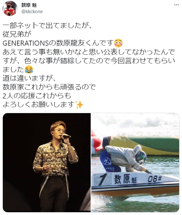 一部ネットでも話題になっていたそうですが、人気パフォーマンスグループ「GENERATIONS」の「数原龍友」さんとは従兄弟関係にあるそうです!