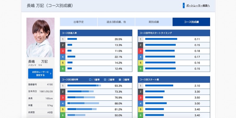 長嶋万記選手のコース別成績を確認すると、1コースの3連対率が93.3%。