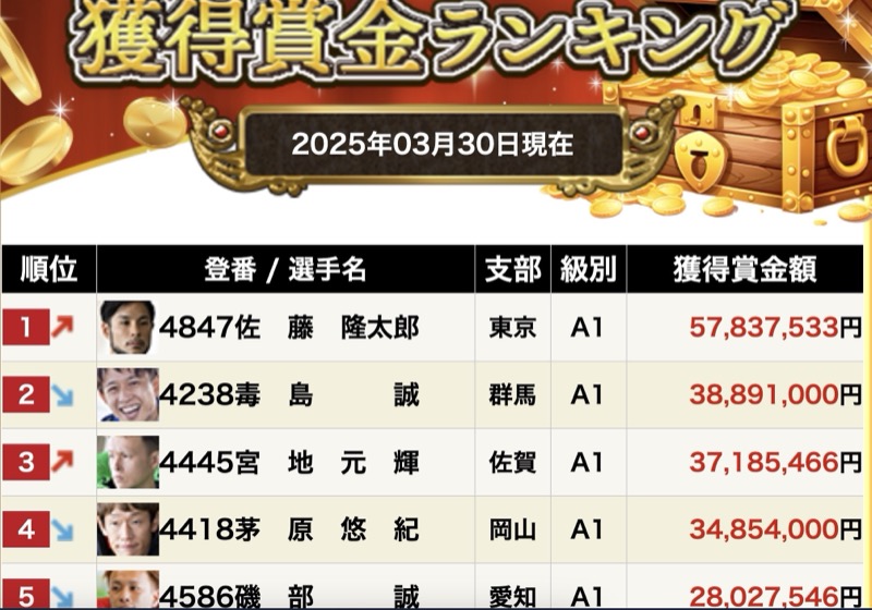 SGボートレースクラシックで優勝した佐藤隆太郎は2025年3月30日現在、獲得賞金ランキングでも1位。