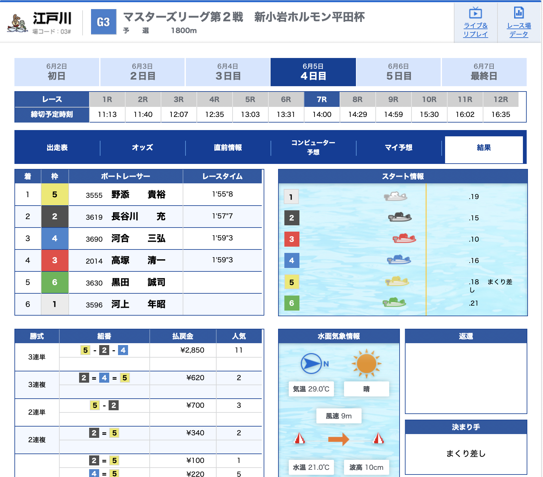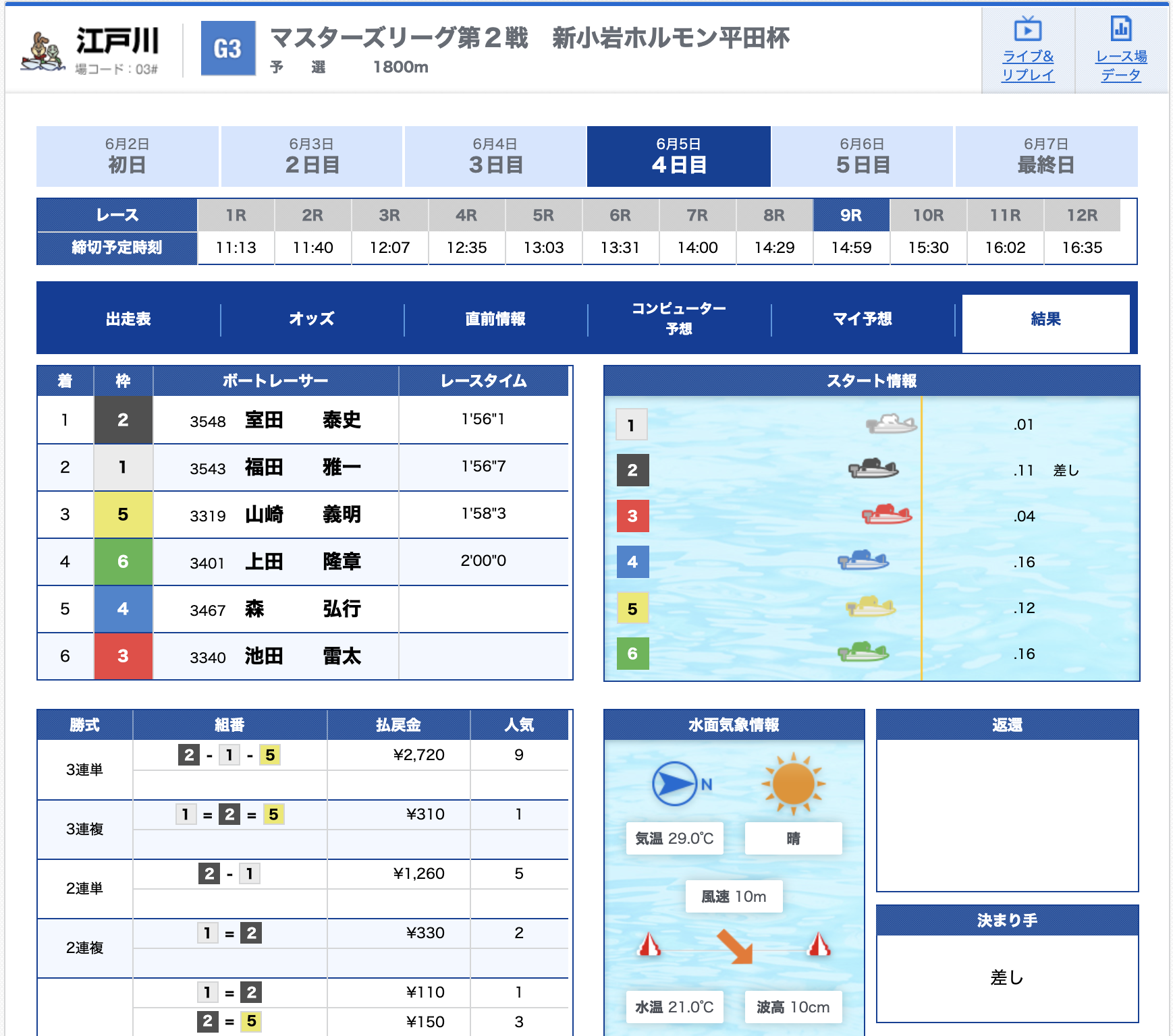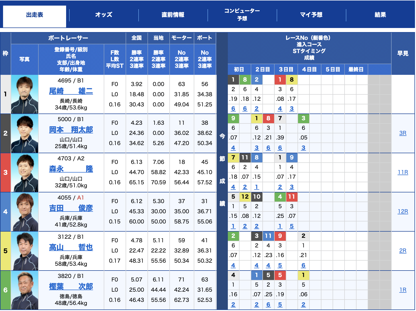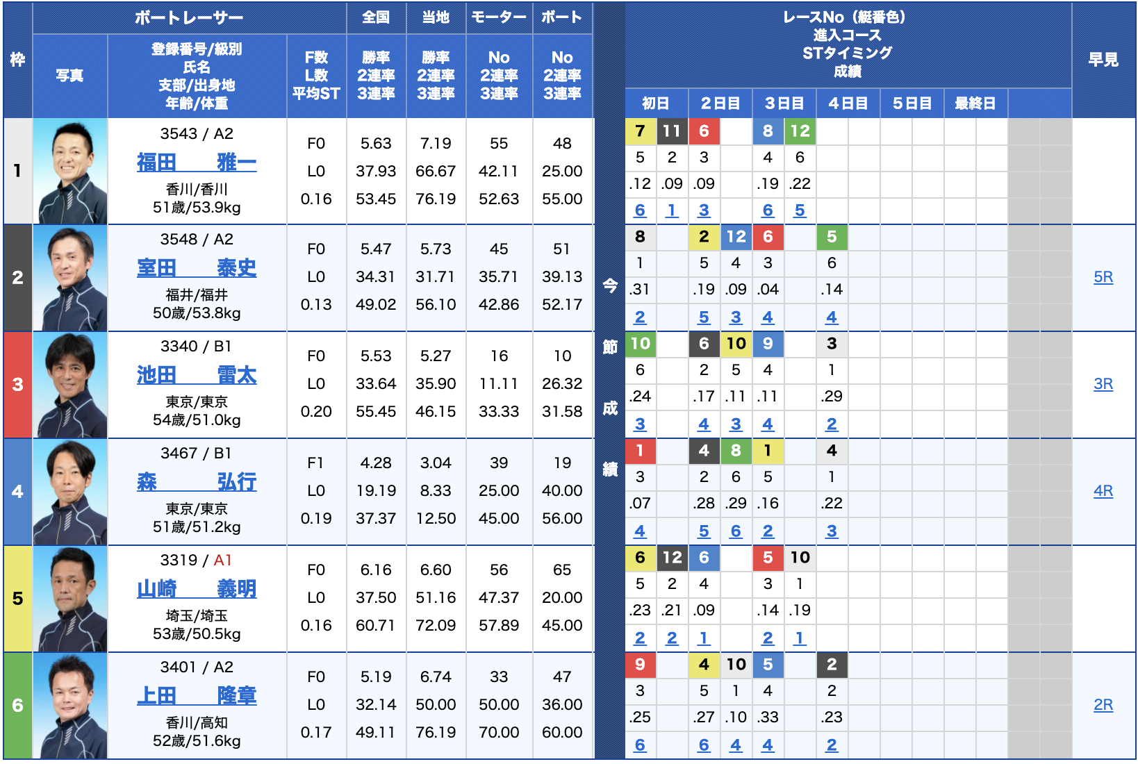 1レース目と同じく5号艇にA1選手がいるものの、こちらのレースは内枠の選手を中心とした予想となっており、私ならば5号艇のA1の山崎選手を中心に予想を組んでしまうのですが、果たして本当に的中するのでしょうのか…?
