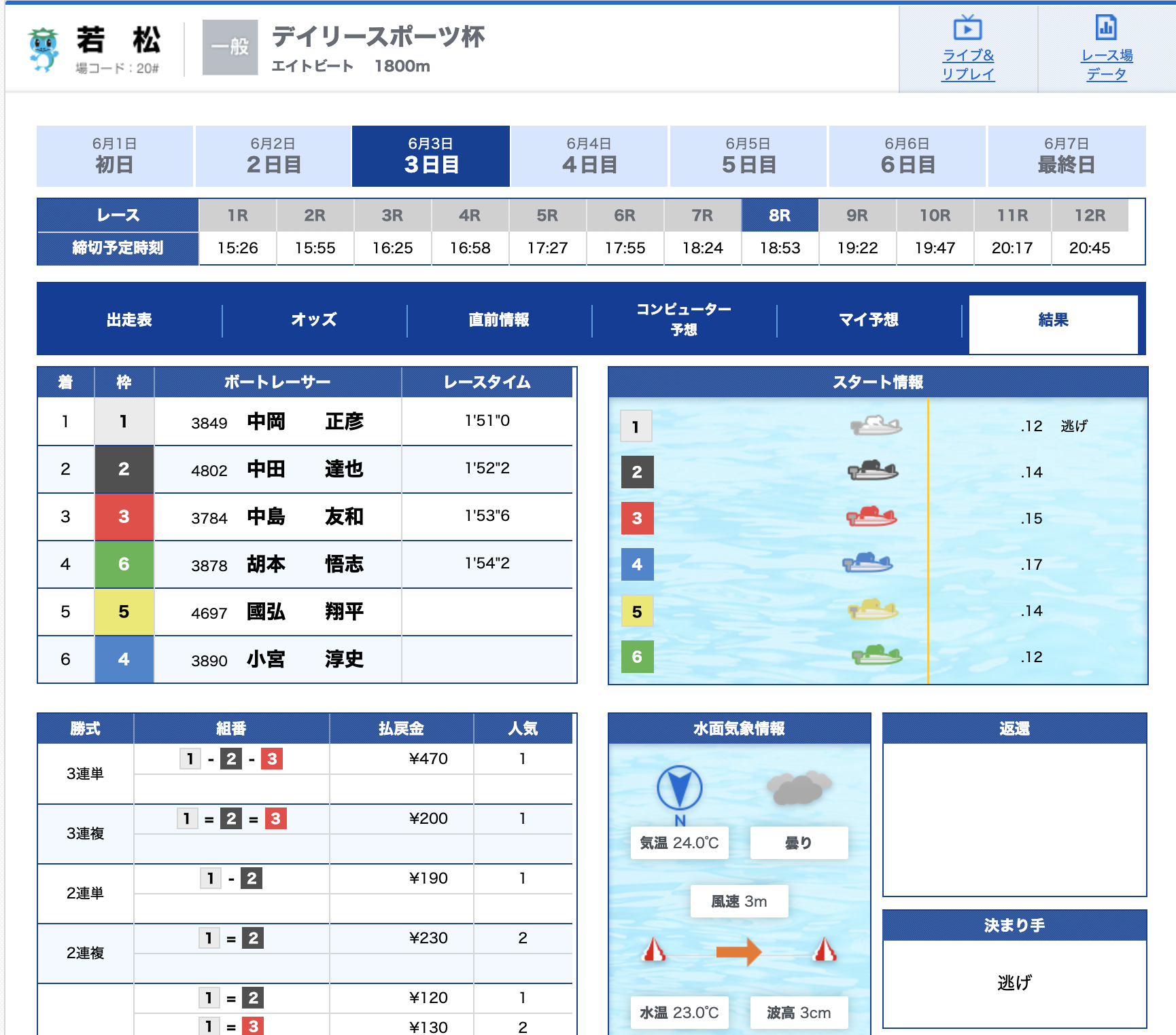 若松8Rの結果は「1-2-3」!見事的中となりました! このレースのオッズは4.7倍、配当金は9,400円となり、トリガミになってしまいましたが、的中したことは評価に値します。