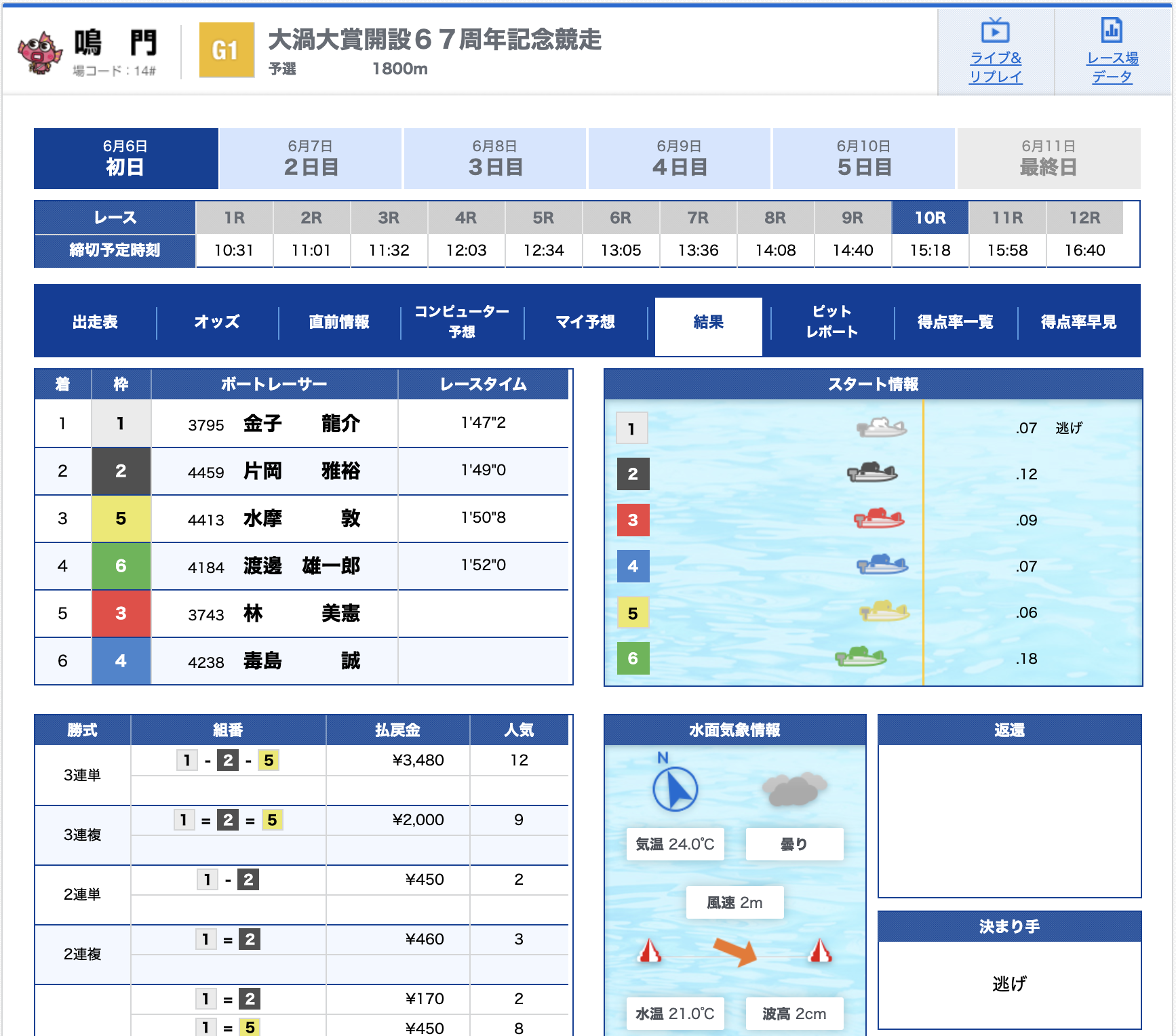 G1「大渦大賞開設67周年記念競走」の初日のレースで「24BOAT」が提供してきたのは、無難な予想4つと大きく勝負をしてきた予想1つとなっており、3号艇のA1の林選手が 乱すのではないかという220.3倍の予想が最後に組みこまれていました。