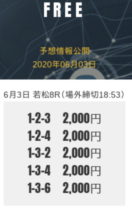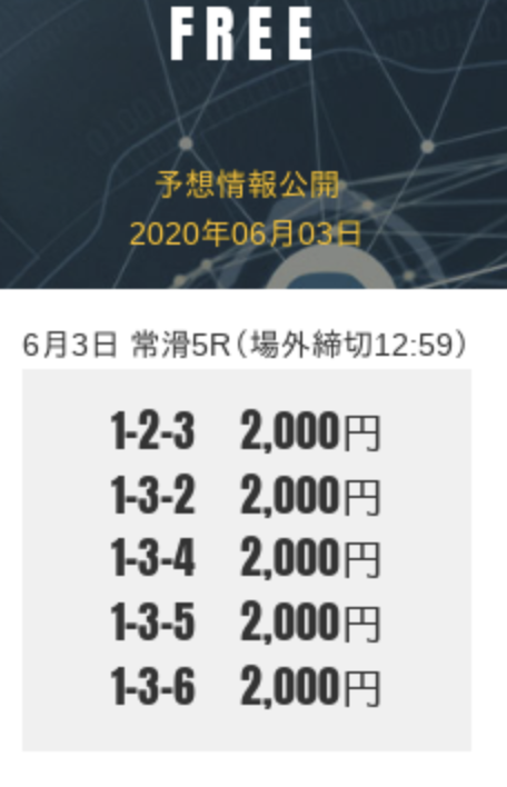 まずは6月3日の無料予想のデイレース、提供してきた予想は画像の通りとなっています。