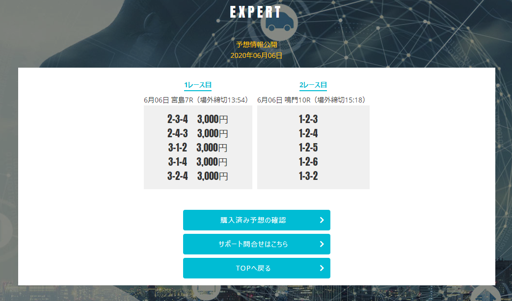 ここまでくるとやはり「24BOAT」の真骨頂である「エキスパート」を試したくなり、担当スタッフの方にメールで訪ねてみたところ、丁度翌日6月6日の「エキスパート」をオススメされました。