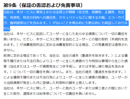 当社は、本サービスに事実上または法律上の瑕疵がないことを明示的にも黙示的にも保証しておりません。