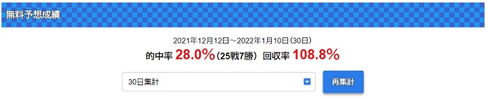 2021年12月12日~2022年1月10日までの30日間の結果はなんと的中率28%、回収率は108,8%でした!