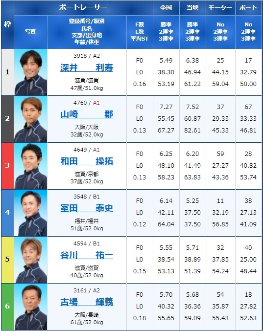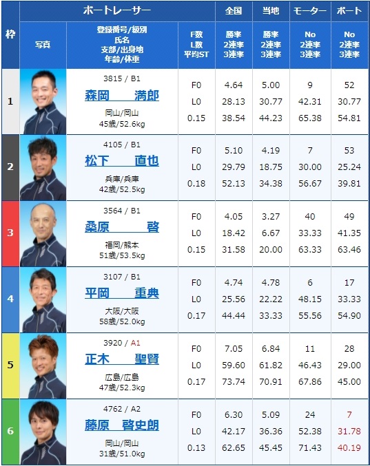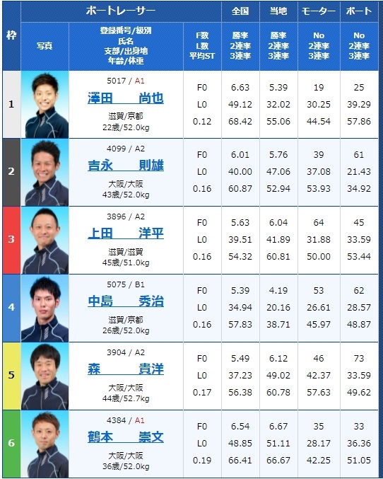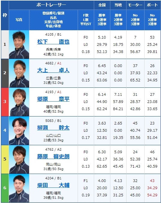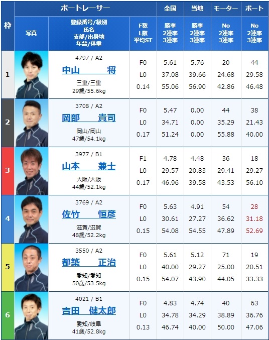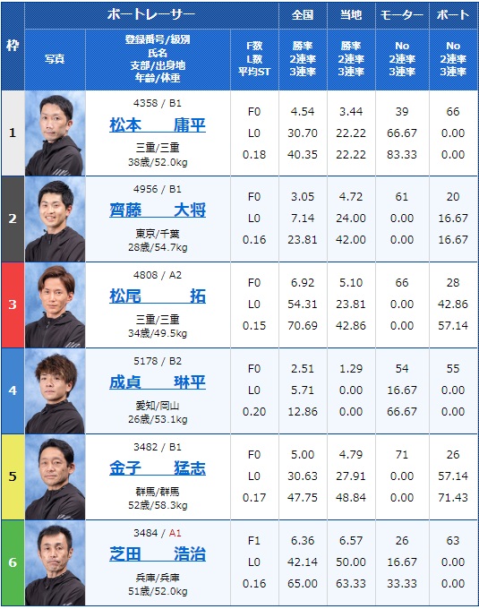 3号艇はA2松尾拓選手、そして6号艇にはA1の芝田浩治選手と実力のある選手がいる一方で、4号艇は勝率2点台の成貞琳平選手、そして2号艇は勝率3点の齊藤大将選手など、実力差が大きく結果に表れそうなレースですね。