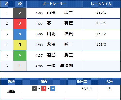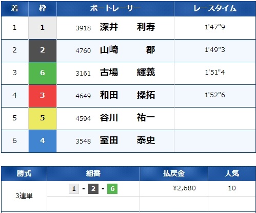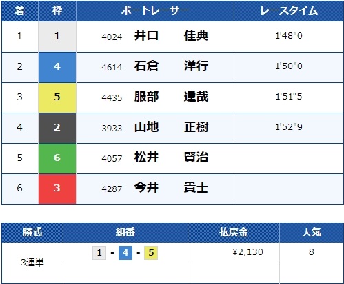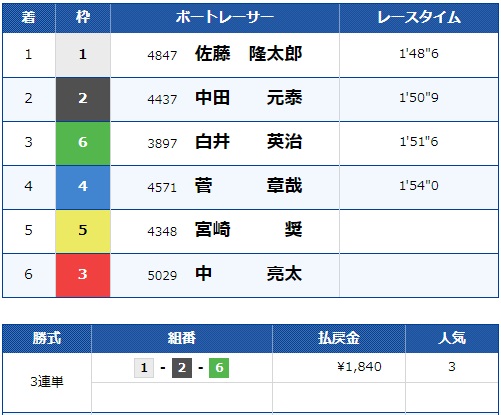 流石に白井選手は飛びませんでしたが2号艇中田選手が2着でしっかり的中です!
