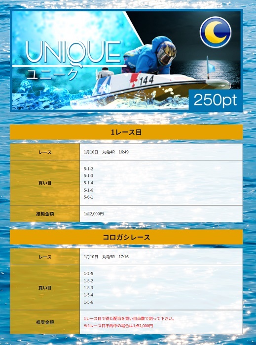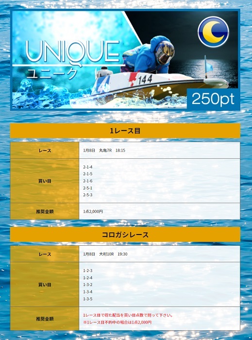 1月8日の予想は丸亀7R→大村10Rです。