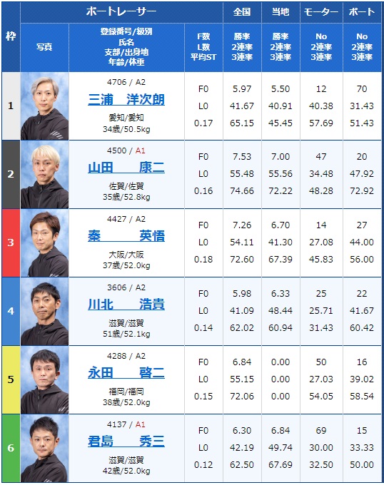 2号艇にはA1山田康二選手、3号艇にはA2ながら勝率の高い秦英悟選手、この2人が実力的には抜けているでしょうか。