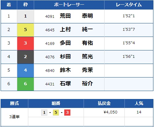 結果は「1-4-2」で的中、オッズは14.3倍で払戻金額は「28,600円」でした! 2着にはしっかり4号艇が来ました。