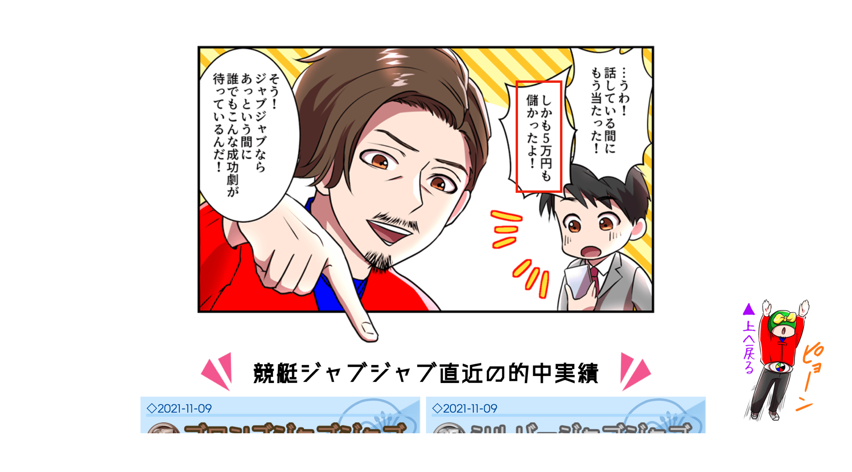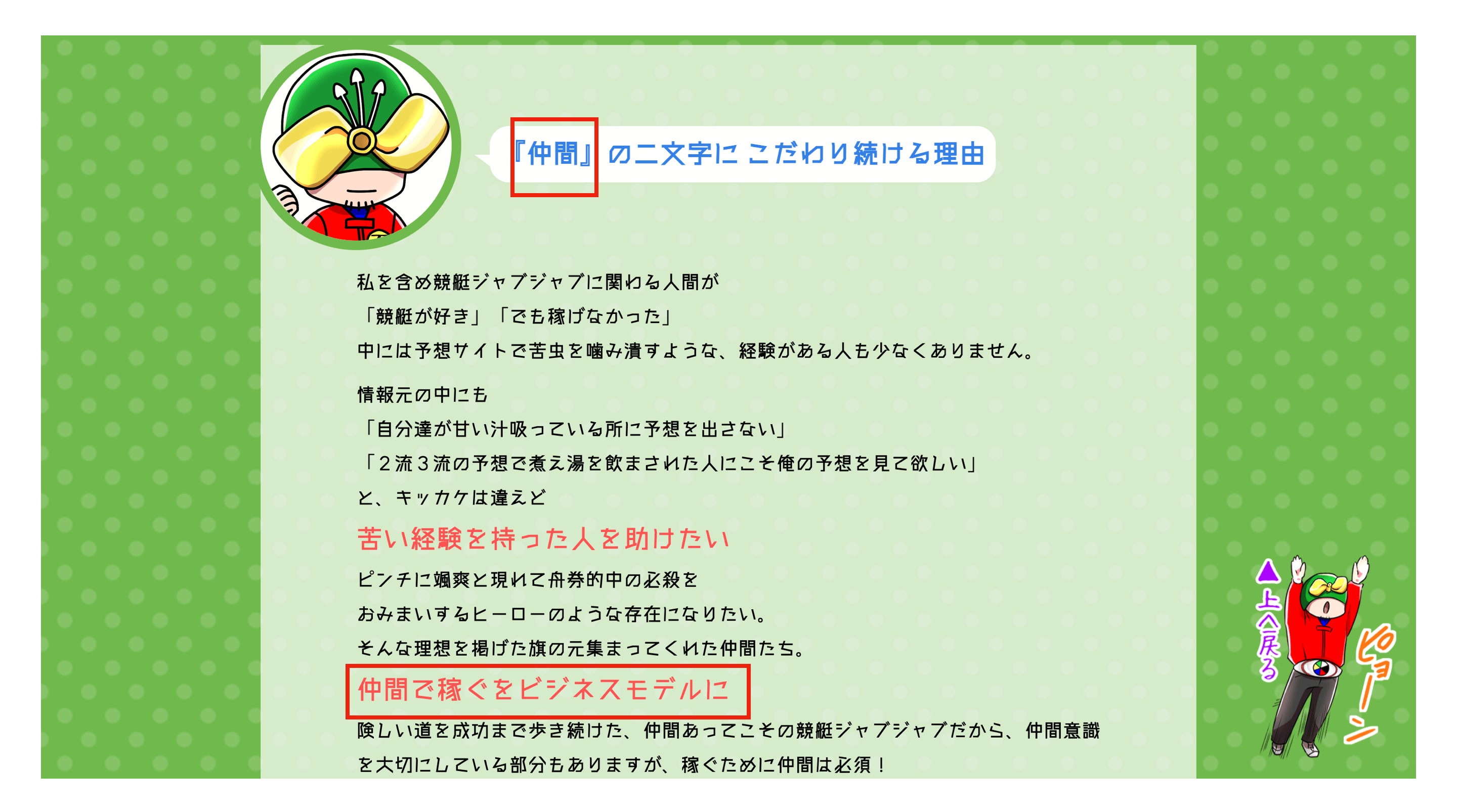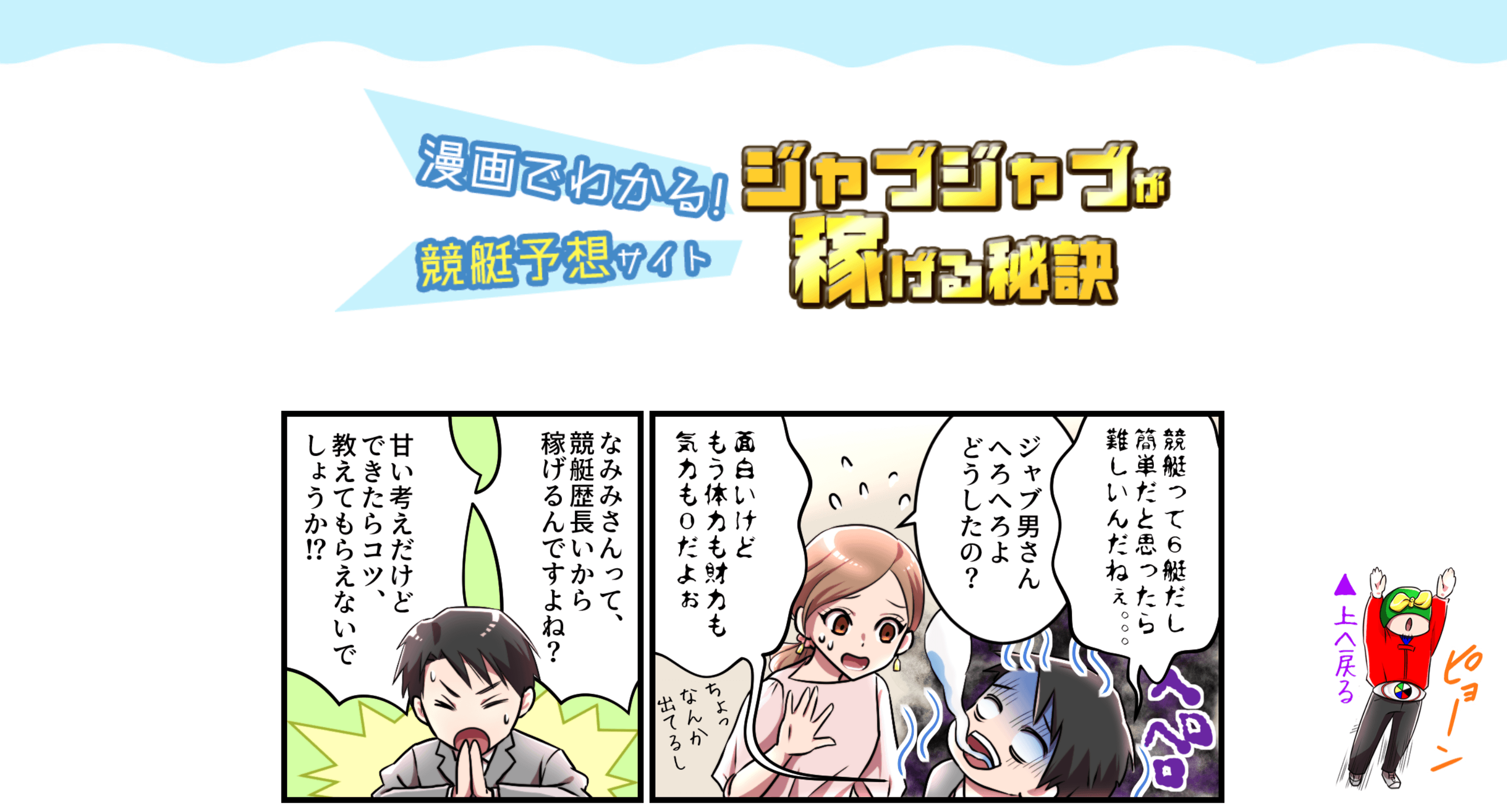 さらに漫画を読み進めていくと、競艇予想サイト「競艇ジャブジャブ」のテーマが記載されていたわ。