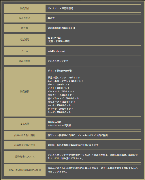 - 販売業者:ボートチェス運営事務局