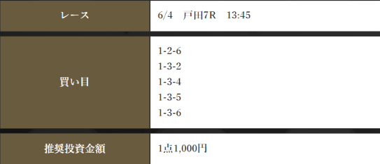 | 6月4日(土) | 戸田7R | 1-2-6 / 1-3-2 / 1-3-4 / 1-3-5 / 1-3-6 | 1-2-3 | 不的中 | 430円 |