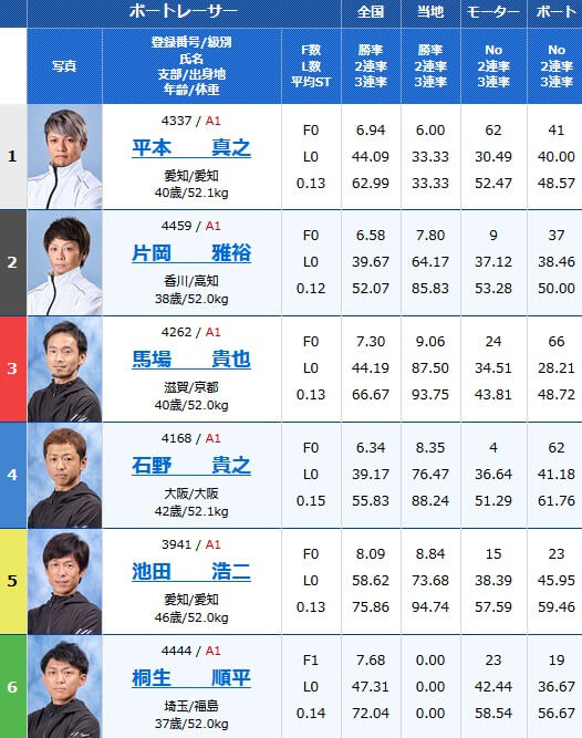 - 【2号艇】A1:西野雄貴(にしの・ゆうき)徳島支部