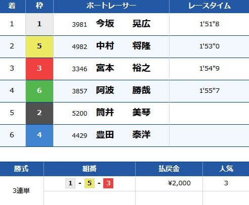 1号艇を軸に3・4・5号艇を買うように指示が来ていましたが、2号艇の筒井美琴はB2級、6号艇の阿波勝哉はチルト0なので納得いきますね。
