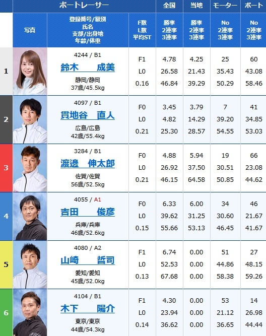 - 【6号艇】B1:香川颯太(かがわ・そうた)滋賀支部