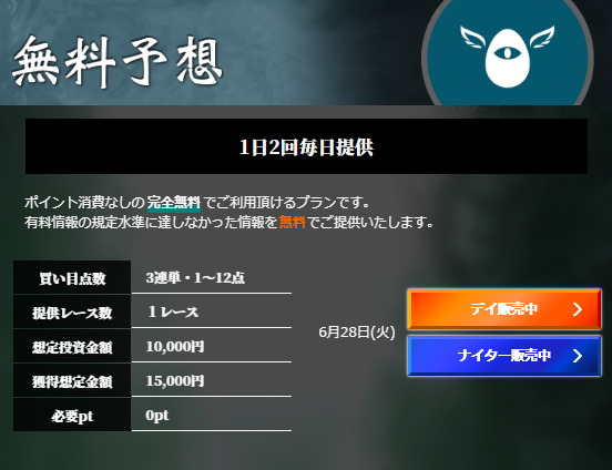 無料予想はデイ・ナイターと毎日2回提供しているのだが、おそらく毎日と書いてあるので365日提供してくれるのだろう。
