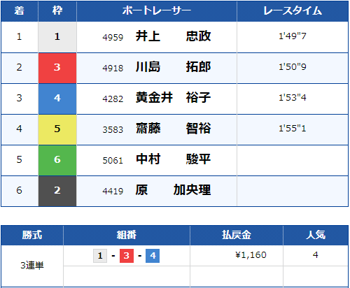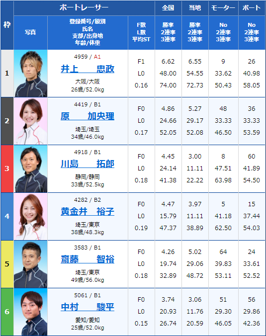 - 【1号艇】A1:井上忠政(いのうえ・ただまさ)大阪支部