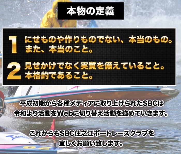 さらに下に行くと、住之江ボートレースクラブが考える本物の定義と、気になる文章を発見。