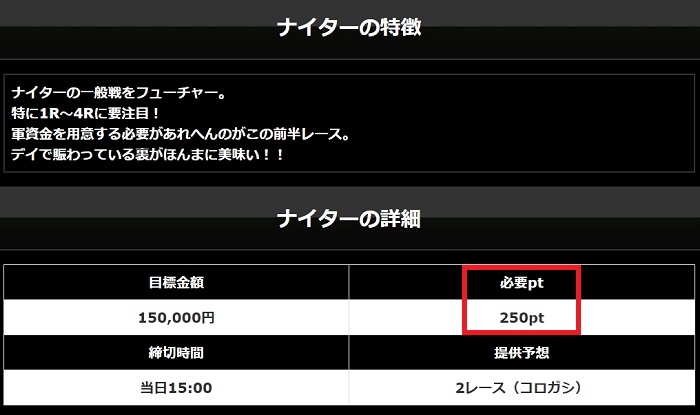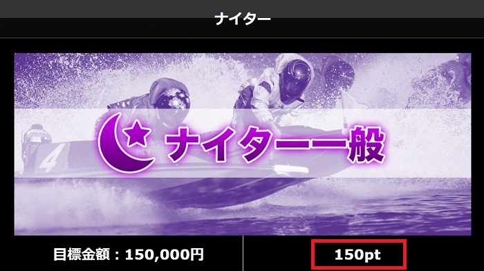 | ナイター一般 | 15万円 | 2レース | 不明 | 不明 | 150pt |