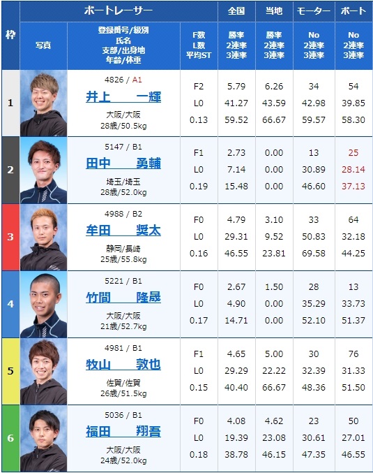 - 【1号艇】:井上一輝選手(A1/大阪)