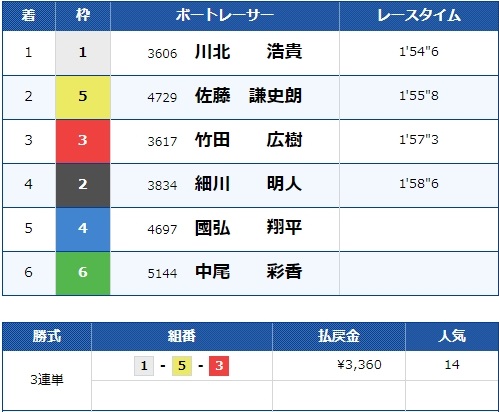 公開された予想では、1号艇川北浩貴選手を中心に2号艇細川明人選手と3号艇竹田広樹選手に注目しています。