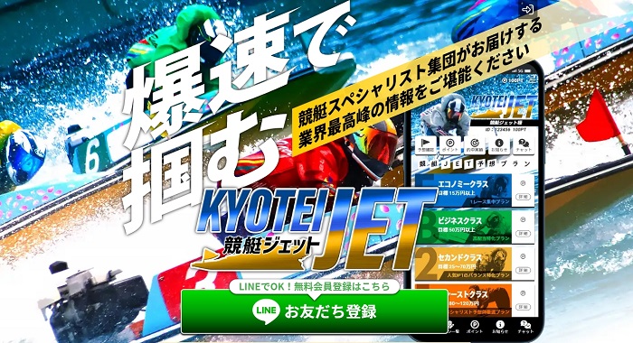 コスパ重視の初回限定プランがあったり、LINEでログインでき全ての機能が見れたりと使いやすさと予想の質を兼ね備えた競艇ジェット!