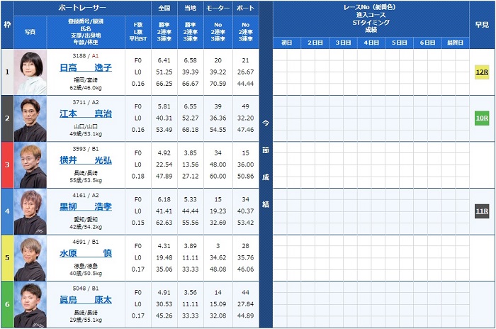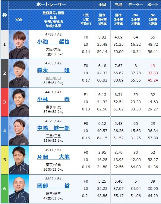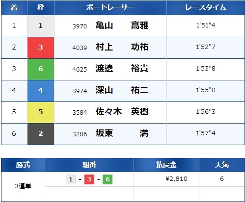 - 【6号艇】:渡邊裕貴選手(B1/静岡)