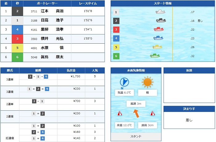 4号艇伊倉光選手が2着にくればさらに美味しいオッズが付きそうですが、果たして結果は