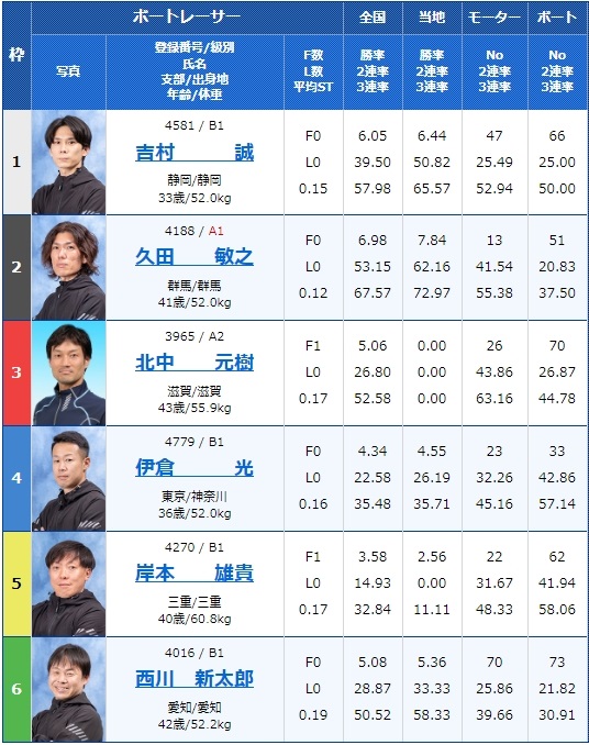 - 【1号艇】:吉村誠選手(B1/静岡)