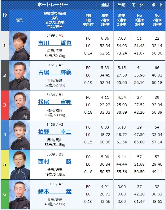1号艇にはA1級の大ベテラン西山昇一選手が入り人気を集めています。